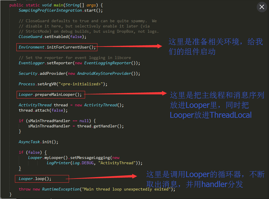 ActivityThread:程序的启动入口,为什么要介绍这个类,是因为该类就是我们说的主线程,它对Looper进行操作的。