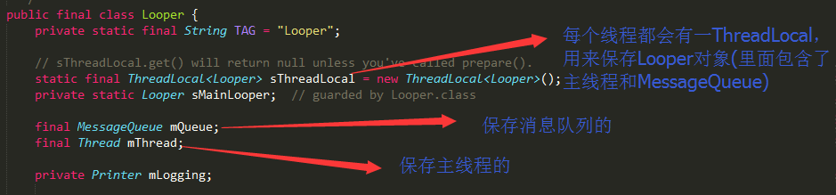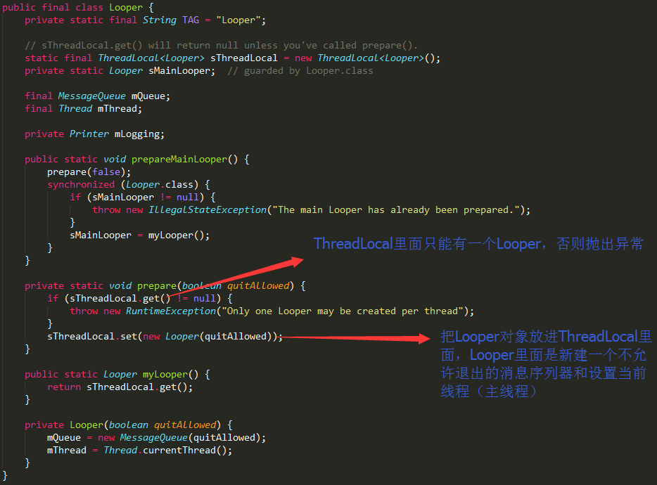 接下来,我们看到Looper类了,我们进去看看里面的源码实现: