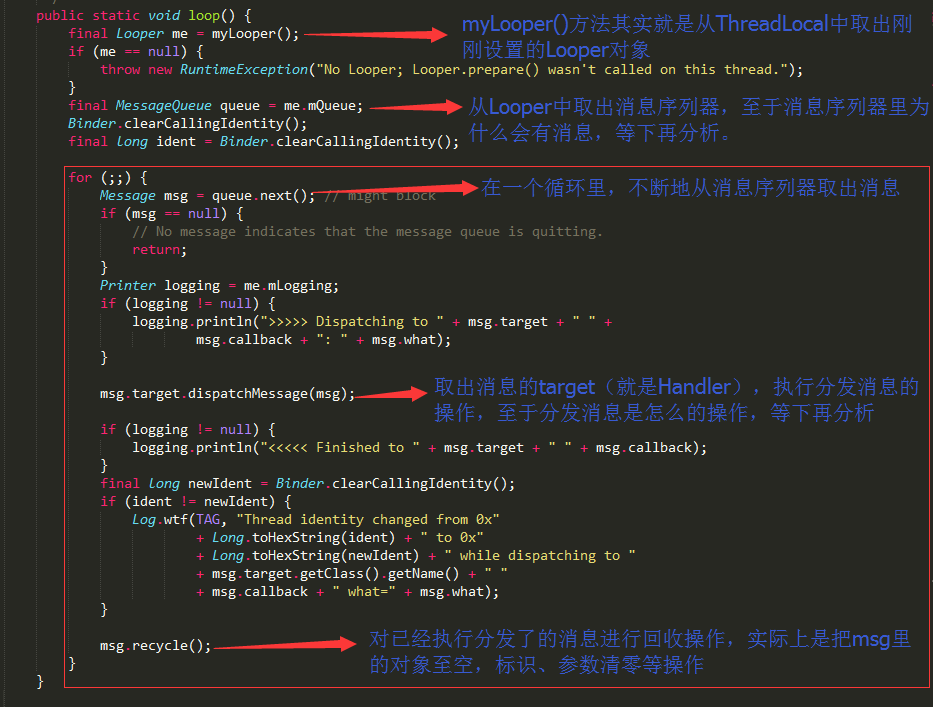 这里我们可以看到,prepareMainLooper是为了设置一个持有消息队列和消息序列器的Looper进去ThreadLocal。接下来我们看看loop方法吧: