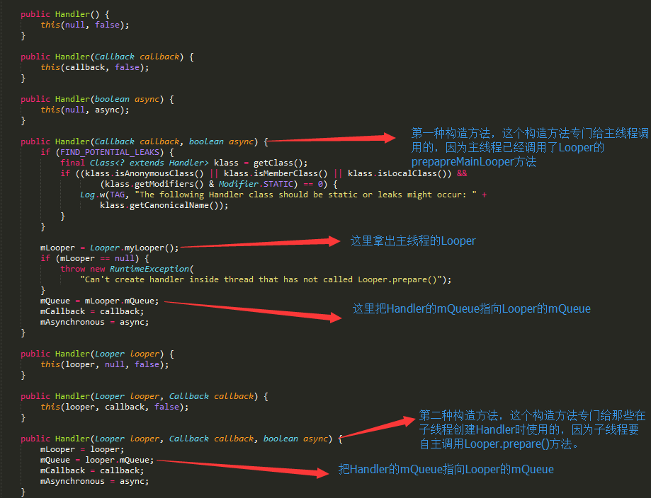 接着,我们看看Handler的构造方法,我们可以看到,Handler有两类构造方法(别看到6个,它们都是往这两种方法调用的):