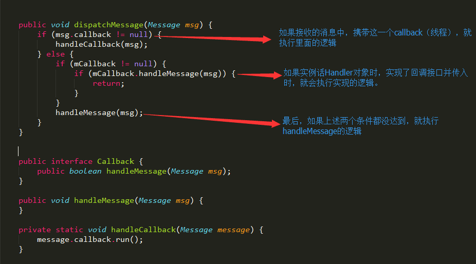 接着,我们要进入Handler.dispatchMessage()方法,因为我们要解释上面刚刚Looper.loop方法。dispatchMessage的方法很简单,只有三个方向,其源码为: