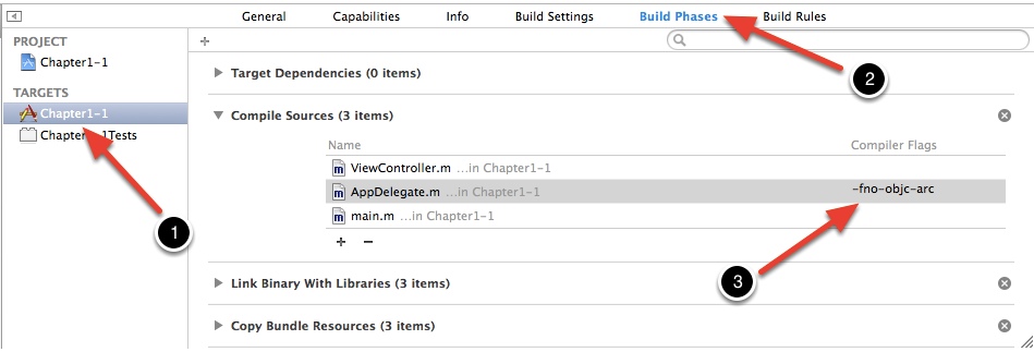加上 -fno-objc-arc 的编译参数(如下图所示),这个参数可以启用手工管理引用计数的模式。