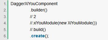 在这一步给DaggerXiYouComponent的builder添加XiYouModule的实例。如果这个Module只需要用到无参构造函数的话可以用一种省略用法:create()方法。可以简写为: