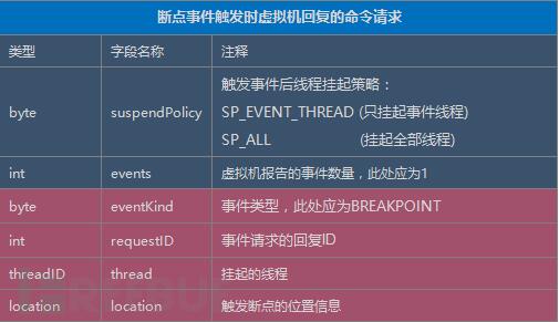 当虚拟机运行到我们设置的断点位置以后,会发送“Event: Composite”命令给调试器,目标虚拟机发送的命令中会包含线事件类型、请求序号、线程序号以及代码位置等信息,其中请求序号和断点命令返回的请求序号是对应的,调试器可以根据请求序号进行相应后续处理,例如获取线程堆栈、变量值等,最后需要恢复虚拟机的运行状态。断点事件报告的字段结构如下图: