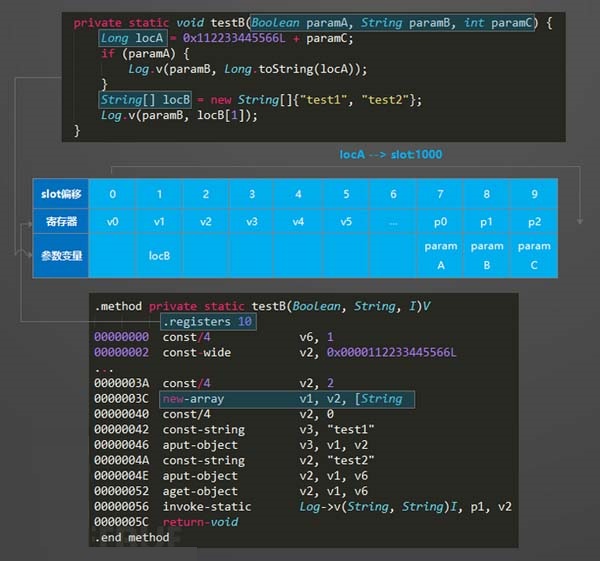 1) frameId值就是当前栈指针的内存地址,函数调用过程中使用的寄存器(参数与局部变量)相当于此处的内存映射,而slot值就相当于映射偏移索引号。参数使用最后的N个寄存器(内存段高地址),局部变量使用从v0开始的前(M-N)个寄存器(注意参数占用2个寄存器的情况)。