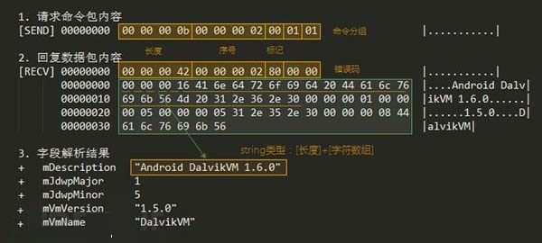 Android虚拟机对JDWP协议的支持实现并不完整,当然调试需要的绝大部分关键命令都是支持的,具体信息可以参考安卓dalvik虚拟机源码:./android/dalvik/vm/jdwp/JdwpHandler.cpp