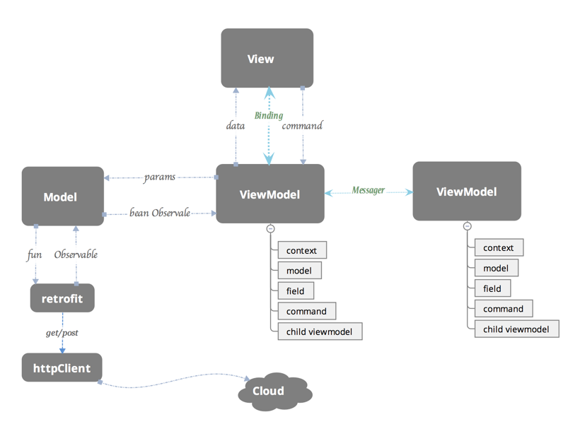 总得来说ViewModel 和View 之前仅仅只有绑定的关系,View层需要的属性和事件处理都是在xml里面绑定好了,ViewModel层不会去操作UI,只会操作数据,ViewModel只是根据业务要求处理数据,这些数据自动映射到View层控件的属性上。关于ViewModel类中包含哪些模块和字段,这个需要开发者自己去衡量,这边建议ViewModel
