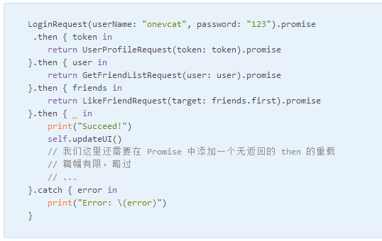 和Promise 其实是同样思想的不同命名,两者基本指代的是一件事儿。在 Swift 中,有一些封装得很好的第三方库,可以让我们以这样的方式来书写代码,PromiseKit