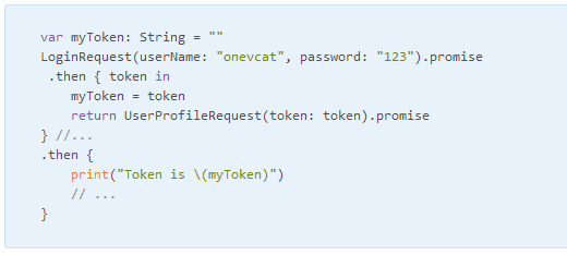 2.各个 then 闭包中的值只在自己固定的作用域中有效,这有时候很不方便。比如如果我们的