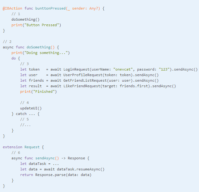 注意,以上代码是根据现在 Swift 语法,对如果存在 async 和 await 时语言的形式的推测。虽然这不代表今后