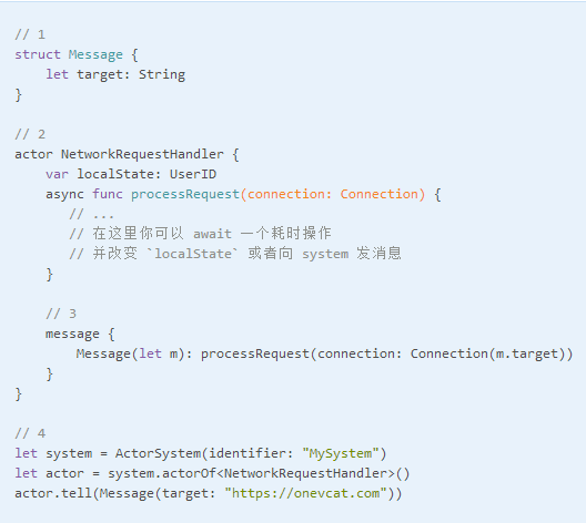 标准库中)。然后创建了一个 NetworkRequestHandler 参与者,并向它发送一条消息。