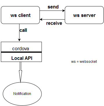 var ws= new WebSocket("ws://localhost:8080/PushNotification"); ws.onopen = function (event) { console.log("connected to server"); }; ws.onmessage = function (event) { var notifys = jQuery.parseJSON(evnt.data); var message = ["New Job Notification",notifys[0].message]; cordova.plugins.localNotification.sendNotify(message); }; |
