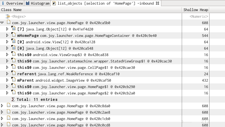 它展示了对象间的引用关系,比如展开后的第一个子项表示这个 HomePage(0x420ca5b0)被HomePageContainer(0x420c9e40)中的