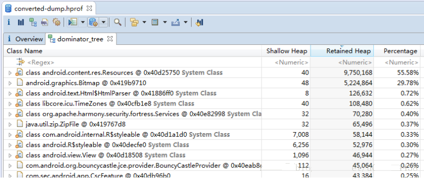 Dominator Tree会将所有内存中的对象按大小进行排序,并且我们可以分析对象之间的引用结构。