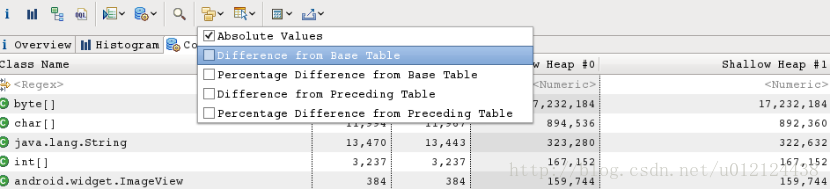 上图最中央的那个饼状图展示了最大的几个对象所占内存的比例,这张图中提供的内容并不多,我们可以忽略它。在这个饼状图的下方就有几个非常有用的工具了,我们来学习一下。