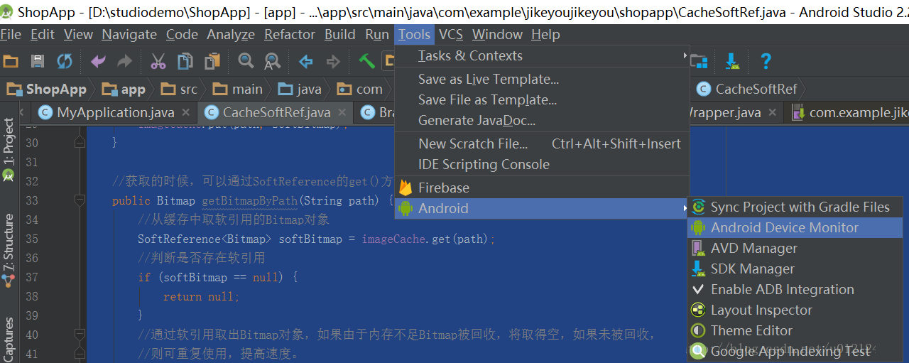 //获取的时候,可以通过SoftReference的get()方法得到Bitmap对象