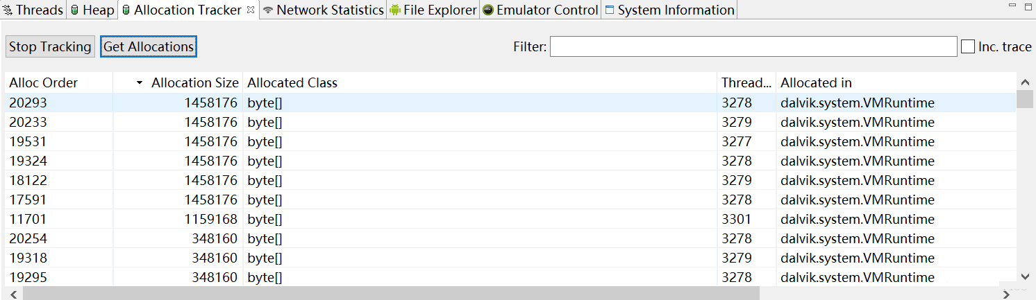 追踪到的内存分配20293次,看着是不是有点无从下手,没关系,用Filter过滤下: