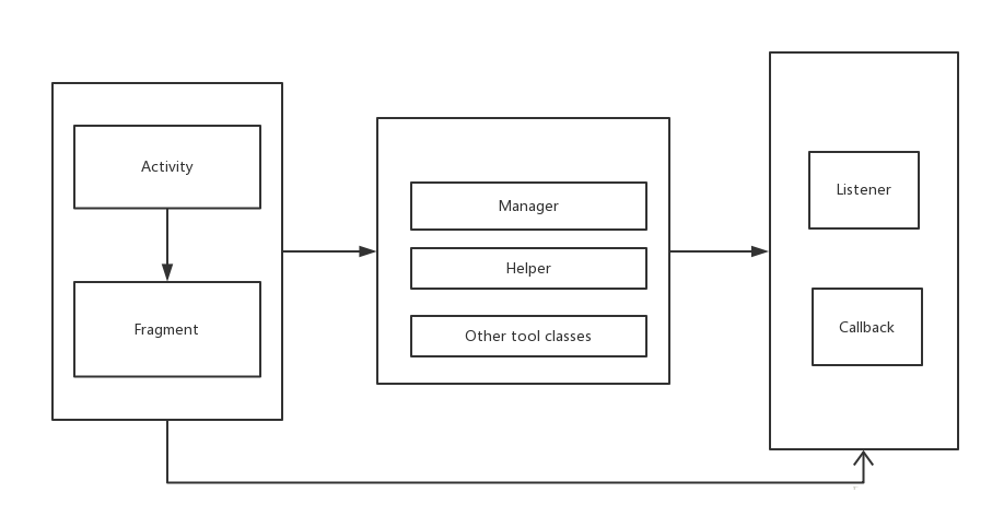 这种架构也就是最原始的Activity-Fragment-Manager模式,Activity或者Fragment通过接口与各Manager沟通联系。这种模式的弊端在于Activity承担了太多的工作,随着项目的进行Activity会越来越大,导致其越来越难以维护。单从MainActivity来说,就足有2500多行。所有的业务代码和逻辑代码全都冗余在一块,甚至还包含了很多Lisenter和Callback的定义,而这些都绝对不应该是Activity的功能。为了更好的维护(当项目变得非常庞大时),我们可以从Activity中把逻辑功能分离处理,交由另外的一个逻辑管理类处理,而逻辑管理类再和其他的工具类联系。这样就可以极大的增加代码的可维护性。