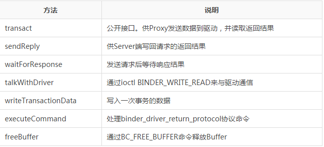 我们先来看看IBinder这个类。这个类描述了所有在Binder上传递的对象,它既是Binder本地对象BBinder的父类,也是Binder远程对象BpBinder的父类。这个类中的主要方法说明如下: