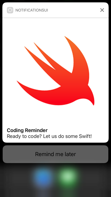 下面一段代码就是创立了一个 "Remind me later" 的 UNNotificationAction