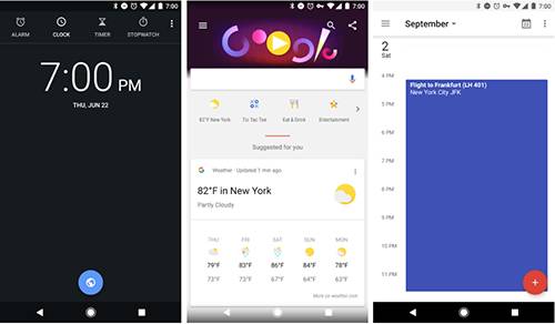 点击时钟软件中的按钮后,会将用户带到一个世界时钟选项界面;点击谷歌选项卡后,会给用户展示更加详细的天气信息;点击创建事件后,会向用户展示事件细节。