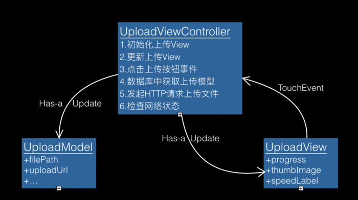 我们可以看到上述需求基本都直接在UploadViewController中实现,目前需求还是比较简单的情形下面,还是勉强能够接受,也不需要更多的思考。如果使用MVP的模式进行优化,如下图所示