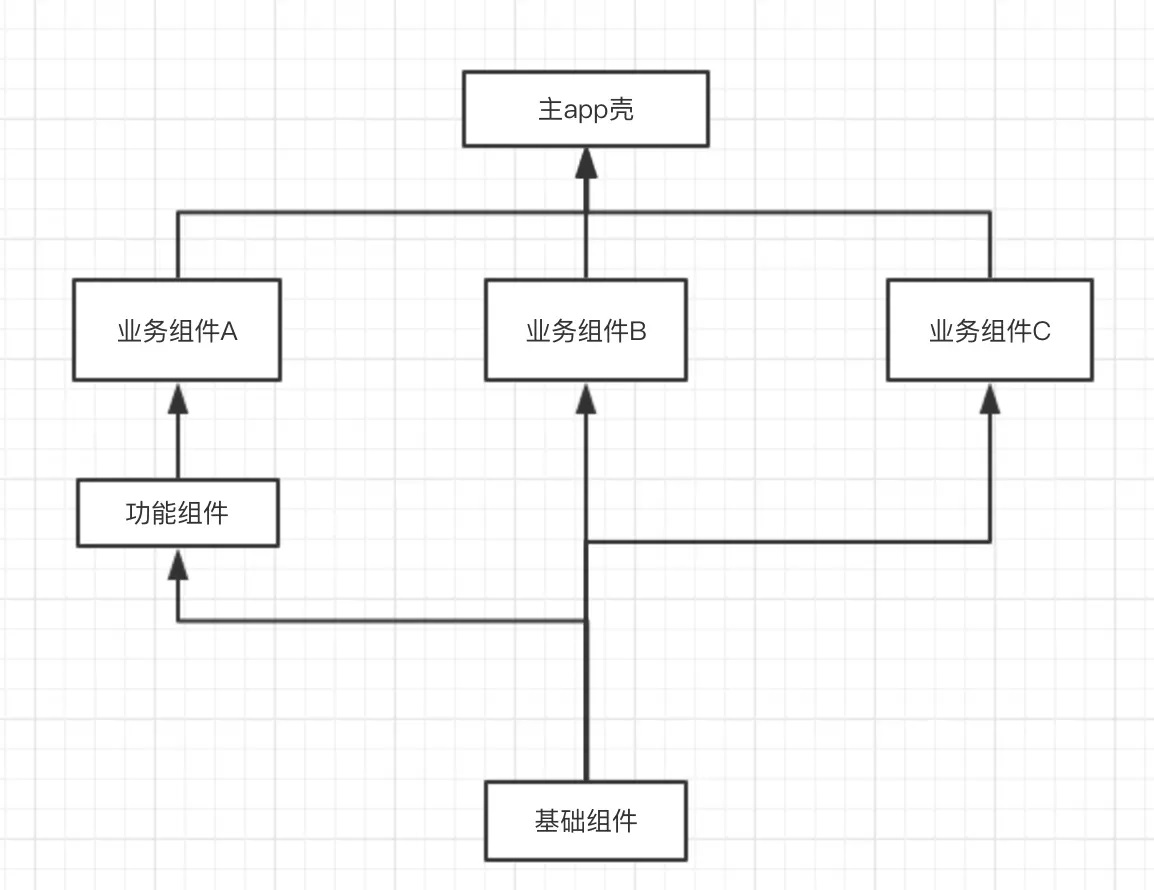 可以看到,每个业务线的业务组件。都分别有一个各自的app壳模块。而主app壳依赖所有的业务组件. 在进行业务开发时。各自业务组成员可以直接运行各自的app壳模块进行测试,主app壳进行全量打包。