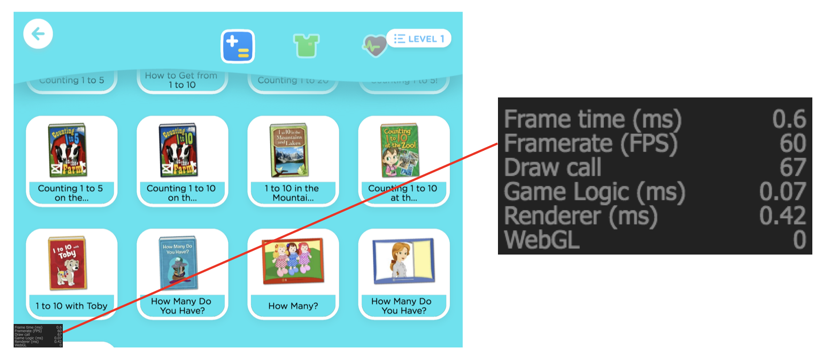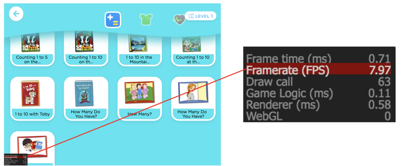 下图这个场景是 ABCmouse 里的二级资源页,由于一次性加载了太多子节点,当屏幕滚动时,帧率降到了