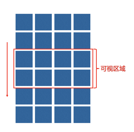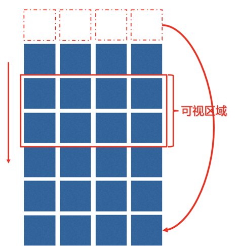 下图是对上述思路的图例。当手势向上,内容往下滚动时,一旦最上排的子节点组件不可视,就立马将它们回收掉并将其重用于将要渲染的子节点组件中。