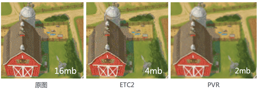 下图可以看到 ETC2 和 PVR 压缩质量和内存占用的直观对比。 对比原图,我们可以看出 ETC2