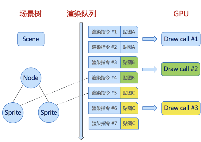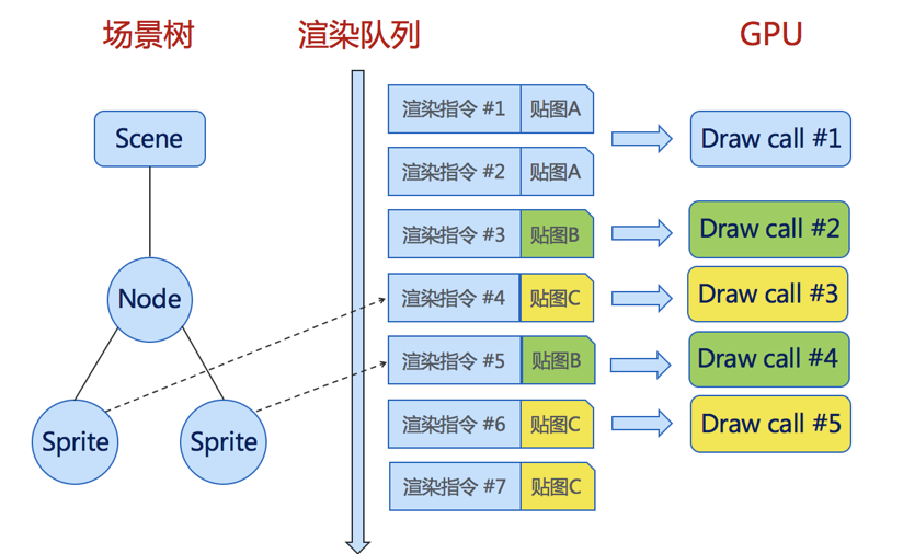 和 5 之间,导致贴图 B 的渲染指令没法合并,从而浪费了多余的 drawcall。通过调整节点层级可以避免这个问题。