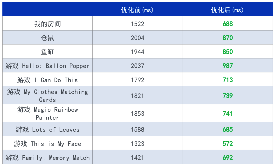 对比原来的场景启动耗时,经过一系列改造和优化后的场景都能控制在 1 秒内启动。