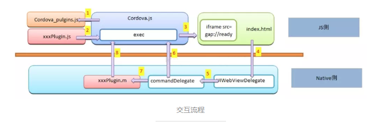 例如:Cordova就是先获取config.xml中的setting项,并保存下来,并初始化一些类为webview加载提供需要。webview加载链接的时候会注入cordova的一些js,还有相对应的Native的Cordova类,这些就是核心的一些东西。都完成后可以说我们的一个容器就可以使用了。其中的细节我们接下来再细分讲解。下面我们来说下具体的JS和iOSNative交互原理:
