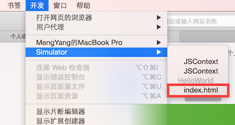 (3)在Safari菜单项“开发” -> “Simulator”中选择对应的html页