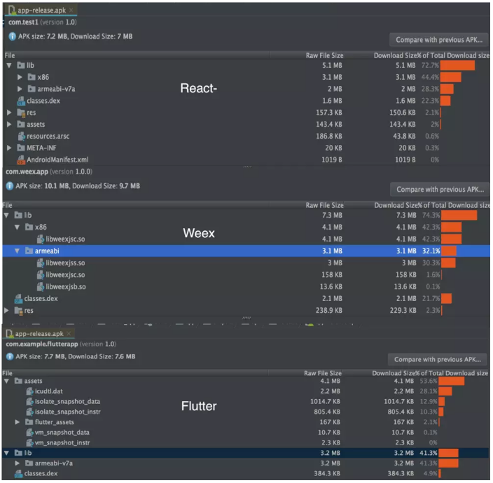 上面Apk大小是通过 react-native init、weex create 和 flutter