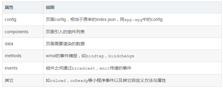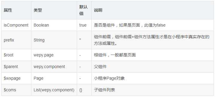 页面入口继承自wepy.component,属性与页面属性一样,除了不需要config以及页面特有的一些小程序事件等等。