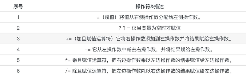 赋值用 = 运算符,如果在前面加上其他运算符(比如 += )就可以组成复合赋值运算符。Dart支持的赋值运算符如下表: