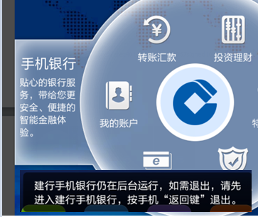 4.再来观看一下某行手机APP,当切换至手机桌面时,会对客户做出提示。如下图:
