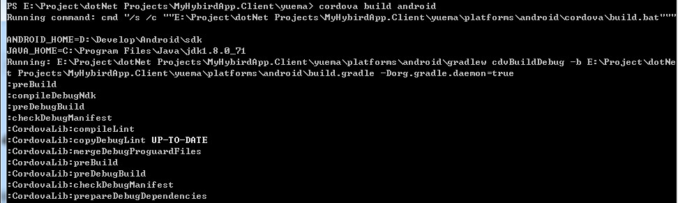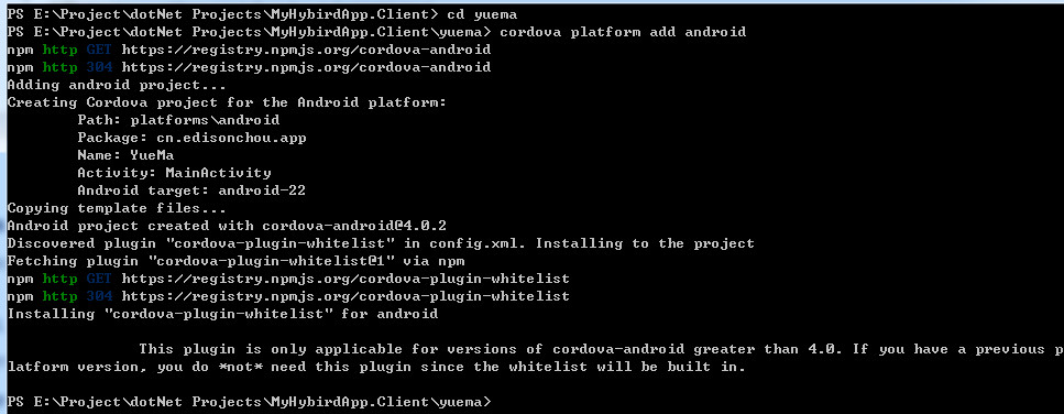 有了一个Cordova的项目文件夹,我们需要增加一个android的platform,因为我们要做的是一个基于android的app。进入yuema文件夹,然后输入以下命令: