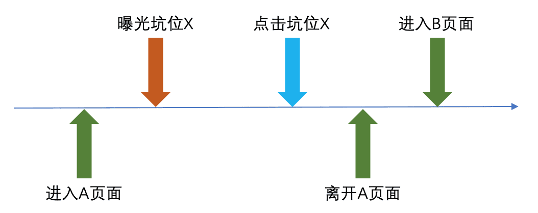 先来讲讲在我们这里是如何定义用户行为埋点的。在如下用户时间轴上,用户进入A页面后,看到了按钮X,然后点击了这个按钮,随即打开了新的页面B。