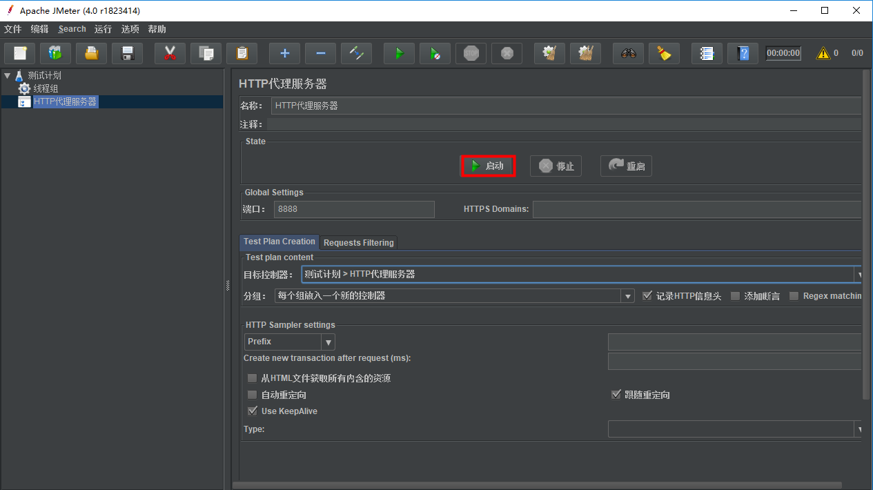 1.在HTTP代理服务器页面点击启动,进入录制状态