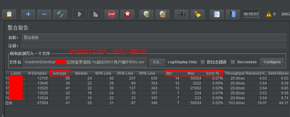 6.测试结束后,查看结果树中的结果是否符合要求,绿色是成功,红色是失败,若失败数过多可重新测试一遍,若失败数较少,则查看聚合报告结果,一般来说samples越大越好,一般也最好测试900s,或者10000条。然后根据性能测试统计表填写数据(平均响应时间、最大响应时间、最小响应时间、错误率)