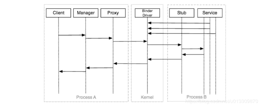 在Android中client不是直接去和binder打交道,client直接和Manager交互,而manager和managerProxy交互,也就是说client是通过managerProxy去和binder进行交互的。同时service也不是直接和binder交互,而是通过stub去和binder交互。如下图。