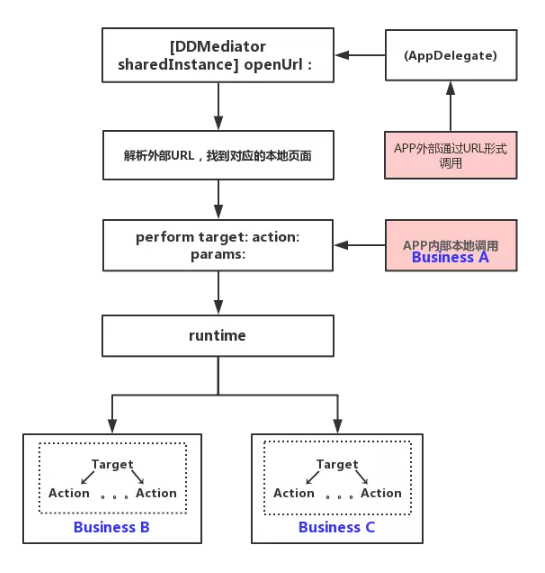 主要是基于Mediator模式和Target-Action模式,中间采用了runtime来完成调用。这套组件化方案将远程应用调用和本地应用调用做了拆分,而且是由本地应用调用为远程应用调用提供服务。