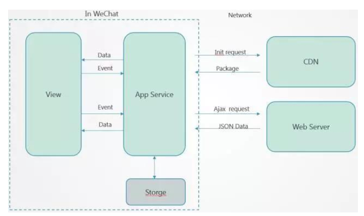 由上图可知,小程序由两大线程组成:负责界面的视图线程(view thread)和负责数据、服务处理的服务线程(appservice