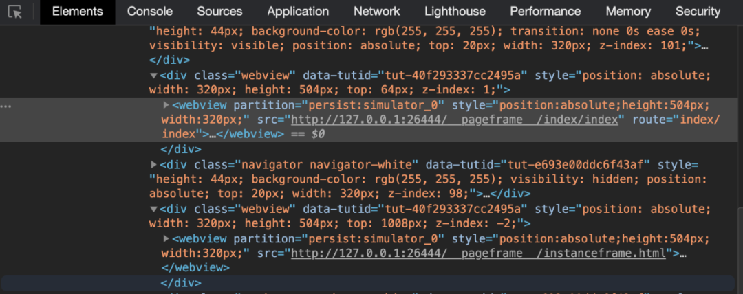 但这并不是小程序的渲染层,而是开发者工具的结构。但我们在里面可以发现有一些webview标签,在第一个webview上的src属性看着是不是有点眼熟,没猜错的话它就是我们当前小程序打开页面的路径。所以这个webview才是小程序真正的渲染层。这里你会发现它里面并不只有一个webview,其实里面包含着视图层的webview,业务逻辑层webview,开发者工具的webview。