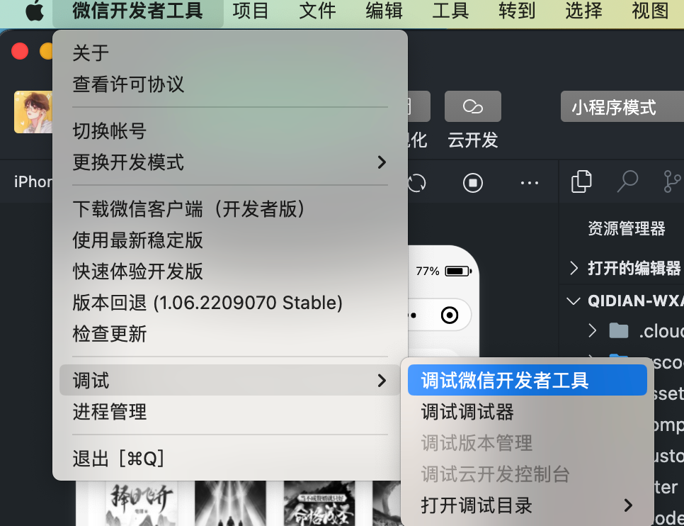1.我们可以通过调试微信开发者工具:微信开发者工具 ->调试 ->调试微信开发者工具