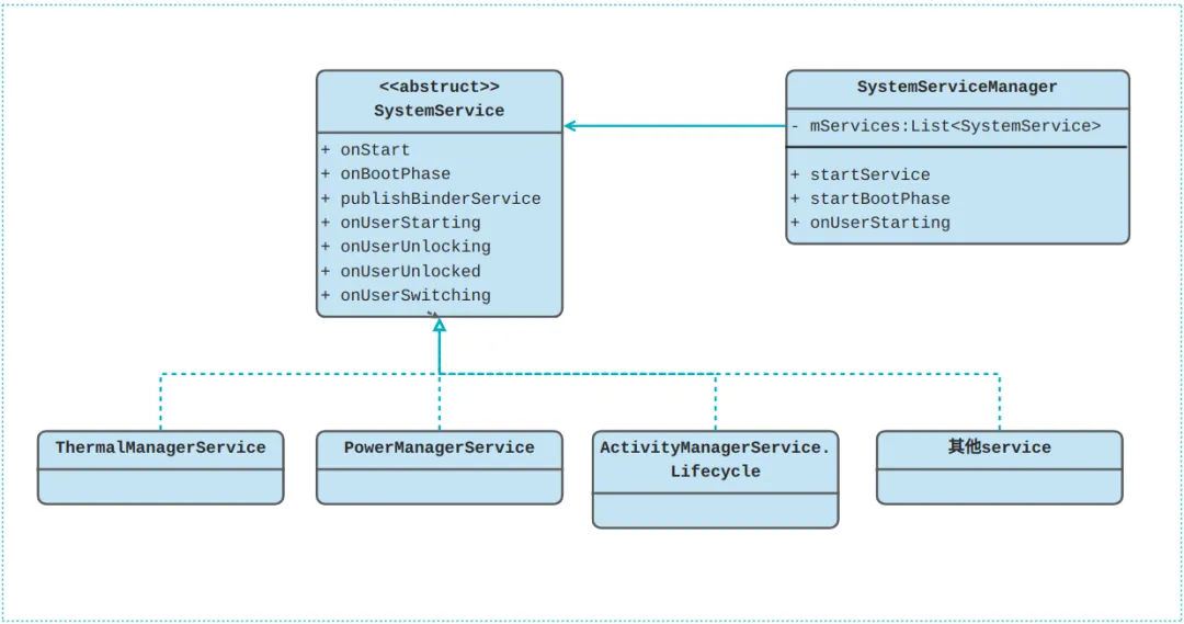 如图,我主要设计了SystemService和SystemServiceManager两个类,先来解释下这两个类。