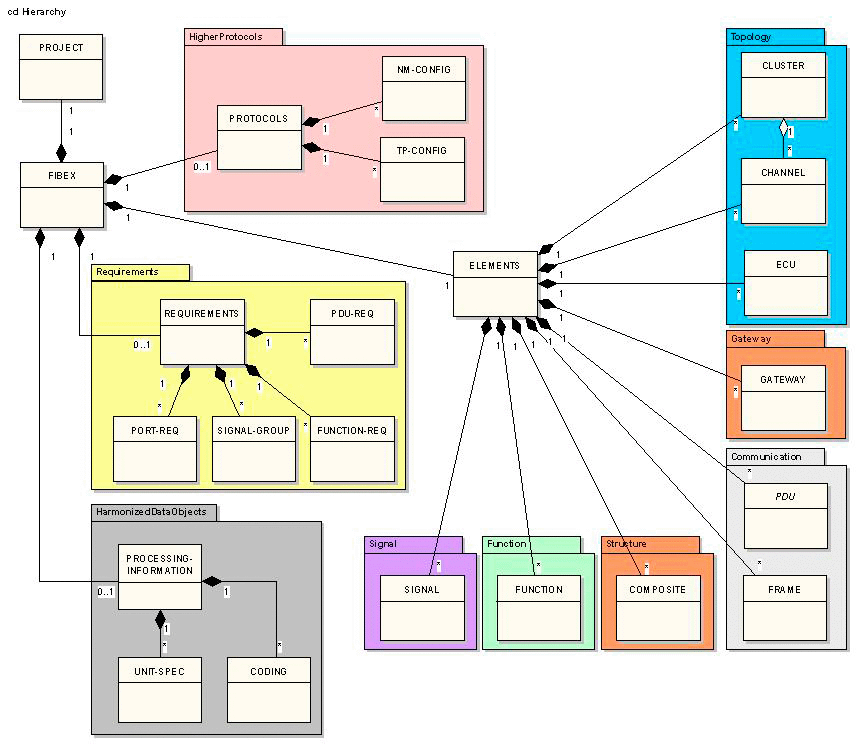 FIBEX标准(参见图1,FIBEX版本3.0)描述了一种支持多协议的格式,用于在面向消息的通信系统(例如车载网络)中交换数据。FIBEX格式可用于导出车载网络数据库,以及在车辆网络开发期间导入不同类型的工具。目前,它支持FlexRay,CAN,MOST和LIN网络协议。从完整集群的设计到其在比特级别上的定义,可以使用FIBEX格式来定义与车辆网络的描述相关的所有信息。
