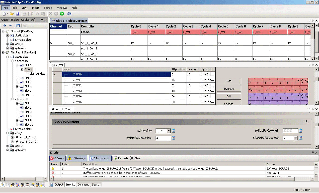 FIBEX文件(FIBEX3.0.0)分为几个区域。拓扑包含关于各自的集群和电子控制单元(ECU)的信息,以及ECU如何通过信道互连的信息。所有全局FlexRay参数都存储在集群中。此外,网关元素可用于确定不同总线系统之间的路由行为。这提供了定义帧、PDU和信号的映射行为的能力。通信对象,如帧和PDU,以及它们的定时行为在通信区域中定义。在FIBEX中,PDU存储为交互层协议数据单元。信号在PDU中分组。从协议的角度来看,FIBEX下的帧是数据链路层协议数据单元。在帧中指定一个或多个具有附加信息(例如更新位)的PDU。通信对象的定时行为在用于绝对调度的定时、事件控制的定时、循环定时和请求控制的定时参数中描述。FlexRay使用绝对预定的定时,除其他外,用来描述发送给定通信对象的时隙和周期。进一步的领域是功能和信号。